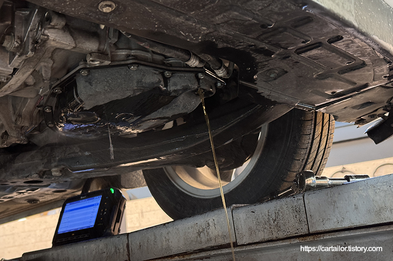 신유 주입이 끝났으면 시동을 건뒤, 변속을 통해 오일 순환 그리고 온도를 올리는 시간을 가진 뒤, 일정 부분 온도가 상승했으면 2회차 배출을 시작합니다.