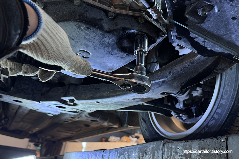 오일 배출이 끝났으면 레벨링플러그 규정 토크로 체결합니다.
