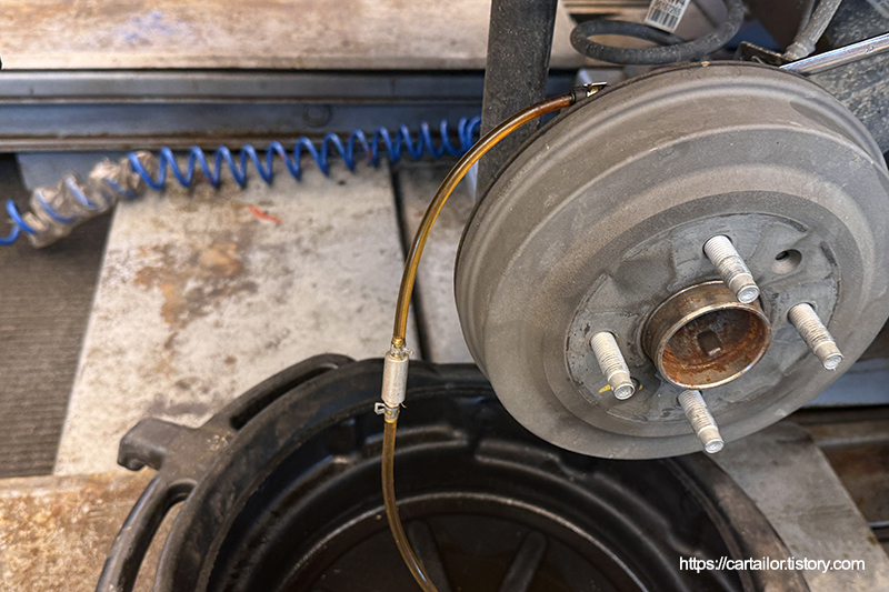 신유로 압력이 걸려 있기 때문에 브레이크액 브리더를 살짝 열면 사용유가 자연스럽게 배출되며 신유로 교환됩니다. 작업이 끝난 브리딩볼트는 토크렌치를 사용하여 규정값으로 정확하게 잠가 줍니다.