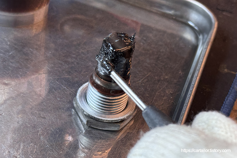 배출되는 오일이 방울 단위 혹은 미량으로 배출되기 시작하면 재빨리 신품 가스켓으로 교체 후 레벨링플러그를 체결합니다.