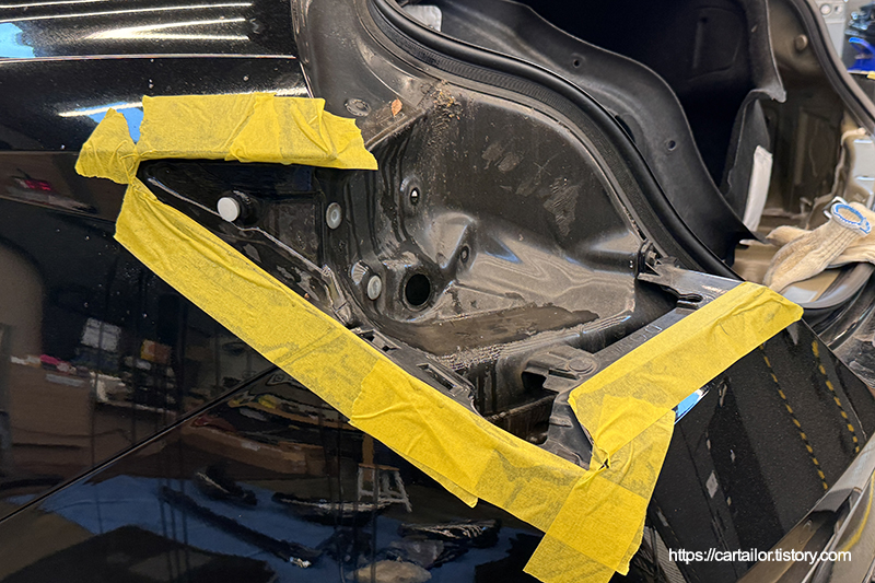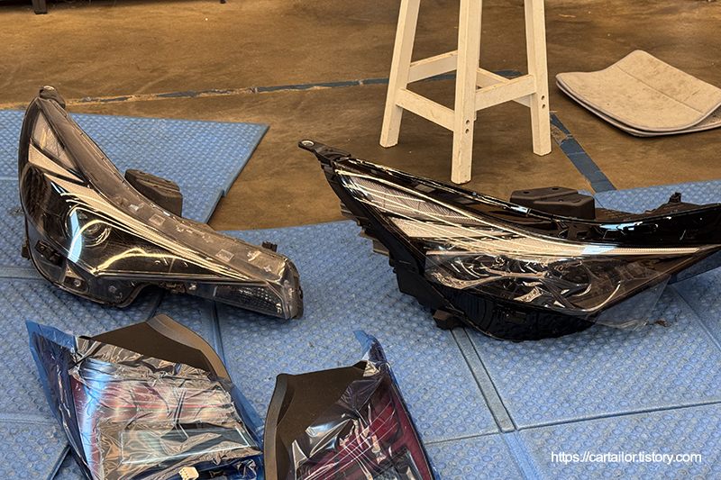 작업 부위 주변을 마스킹한 뒤, 프론트 범퍼 커버와 헤드램프 그리고 테일램프 어셈블리를 탈거합니다.