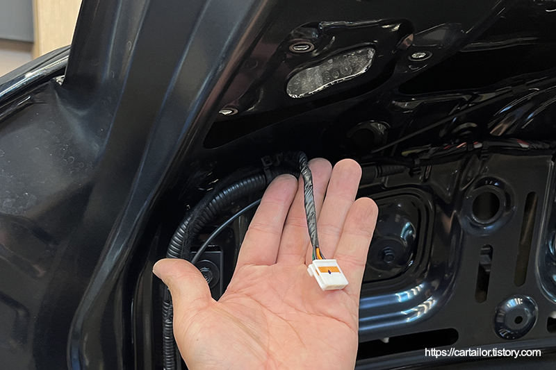 테일램프를 LED 사양으로 바꿀 경우, 별도의 배선 작업을 해줘야 합니다. 순정핀 삽입을 통해 작업하였으며, 트렁크 리드 개폐에 간섭없이 길이를 잡아 고정하였습니다. 외부로 노출된 배선은 콜게이트 튜브와 전기테이프로 감싸 순정 라인을 따라 고정하였습니다.