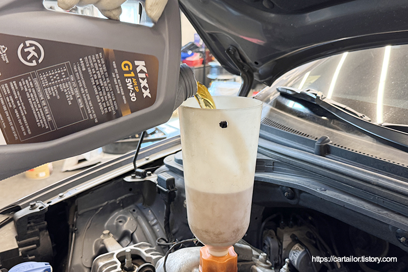 배출된 오일량과 지침서에 명시된 교환용량을 토대로 신유를 주입합니다.