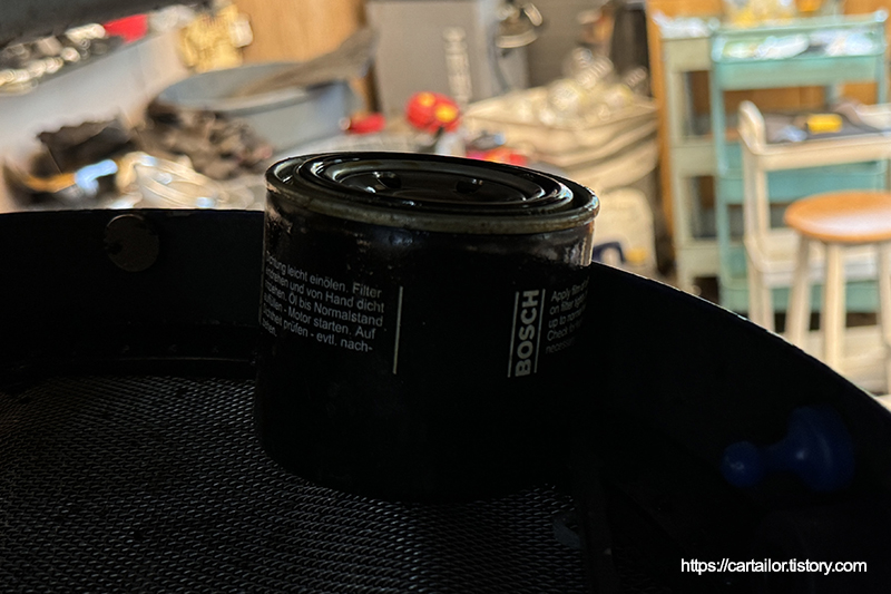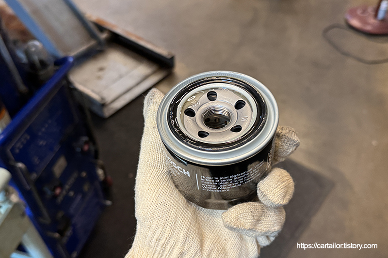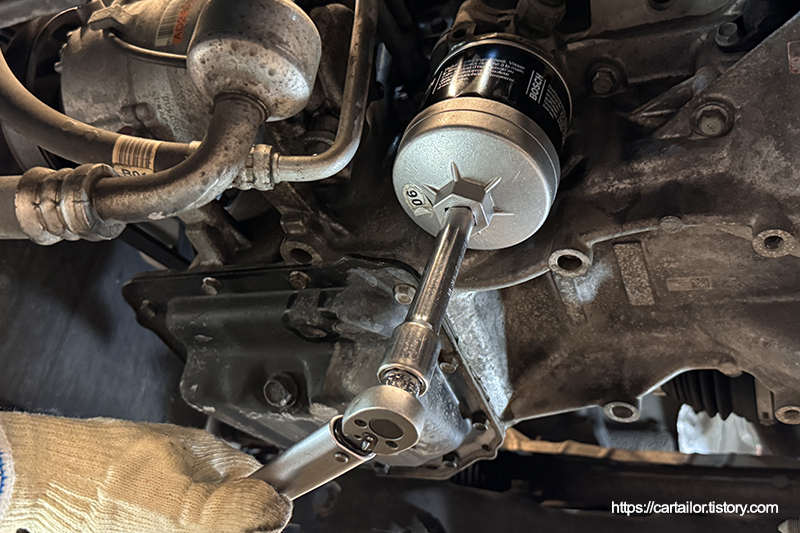 신품 엔진오일필터 오링에 신유를 바른 뒤, 토크렌치를 이용해 규정 토크로 조여줍니다.