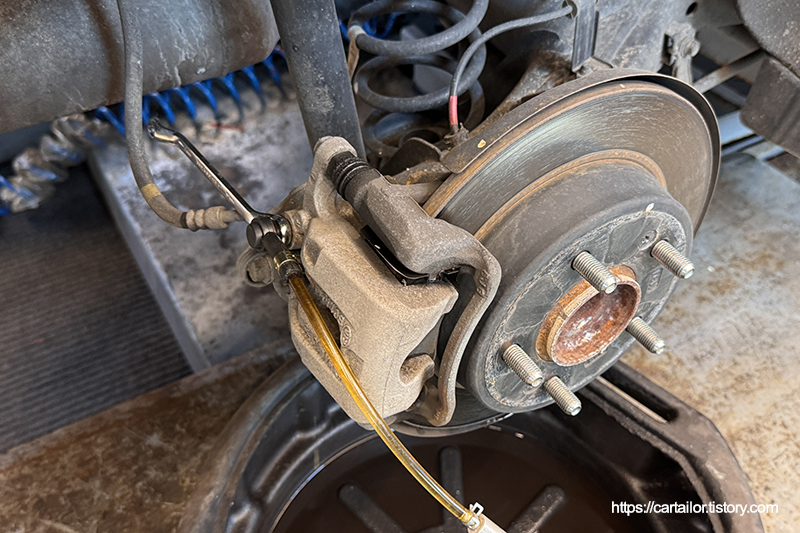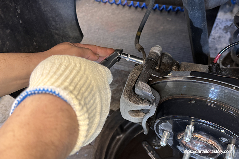 신유로 압력이 걸려 있기 때문에 브레이크액 브리더를 살짝 열면 사용유가 자연스럽게 배출되며 신유로 교환됩니다. 작업이 끝난 브리딩볼트는 토크렌치를 사용하여 규정 토크로 체결합니다.