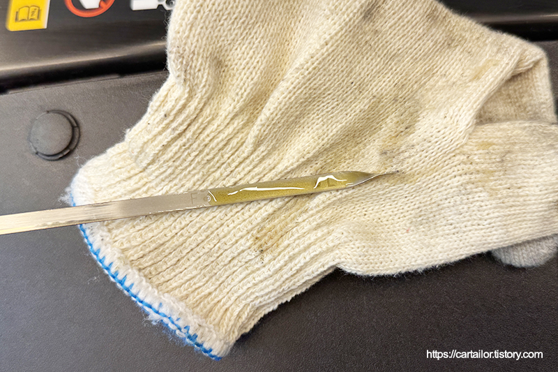 열간 상태에서 시동을 끄고 수분 후, 딥스틱을 뽑아 엔진오일량을 체크합니다. 정량 잘 세팅되었습니다.