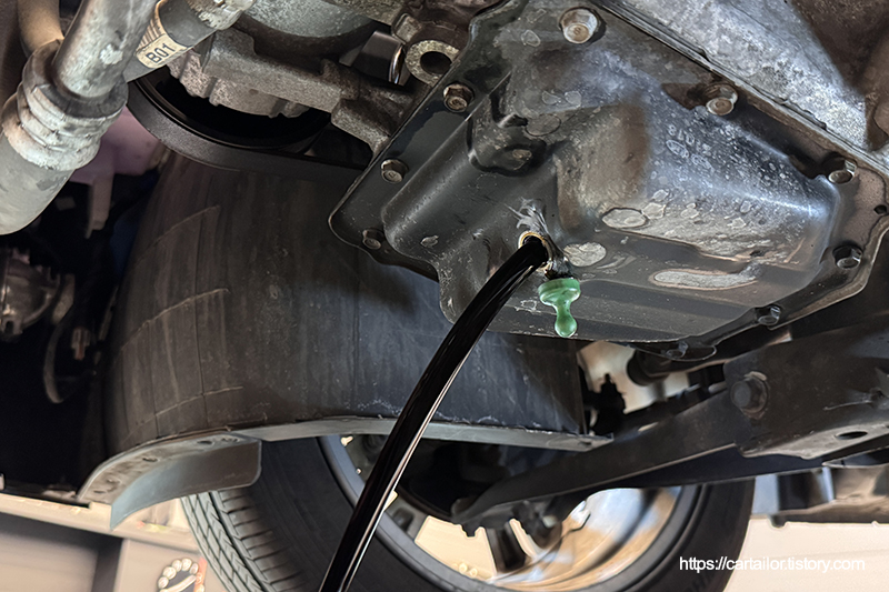 엔진오일의 자연 배출이 멈추면 배출구 형상에 맞게 하부에 고무를 대, 차량 기울입니다. 그 다음, 에어를 입으로 불듯 살짝 열어주면 멈췄던 배출이 가늘지만 한참 더 이어지게 됩니다.