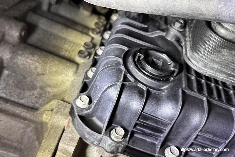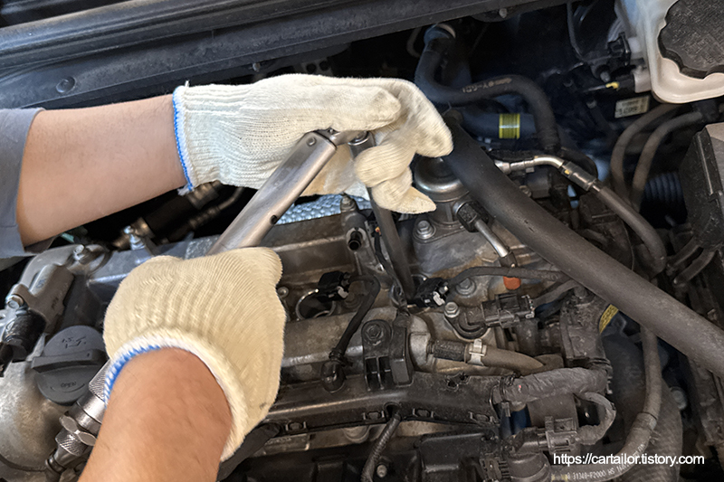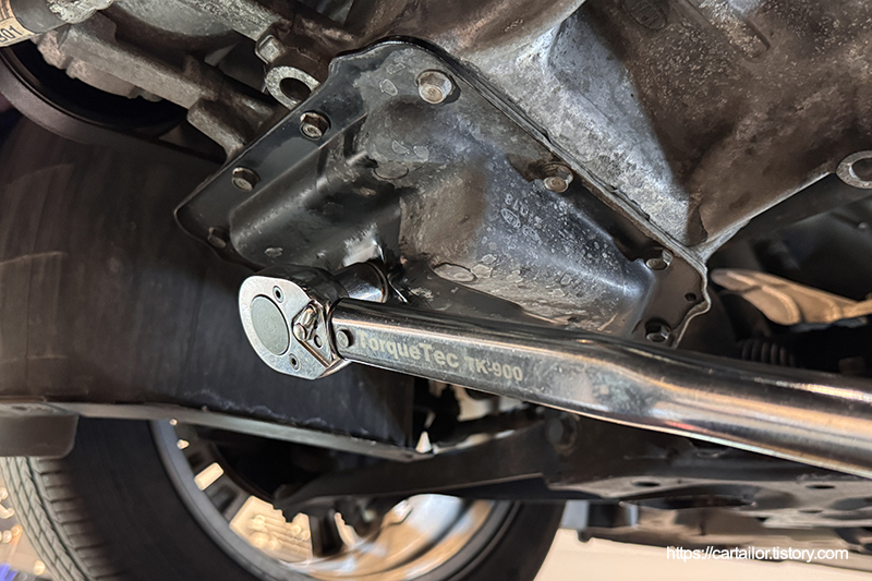미션오일 배출이 완전히 끝났으면 와셔를 교체한 플러그를 손으로 돌려준 후, 토크렌치를 이용해 규정 토크로 체결합니다.
