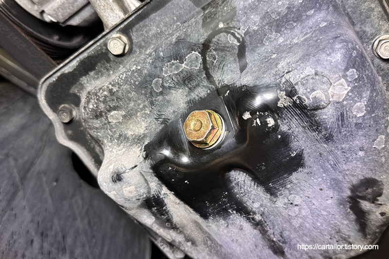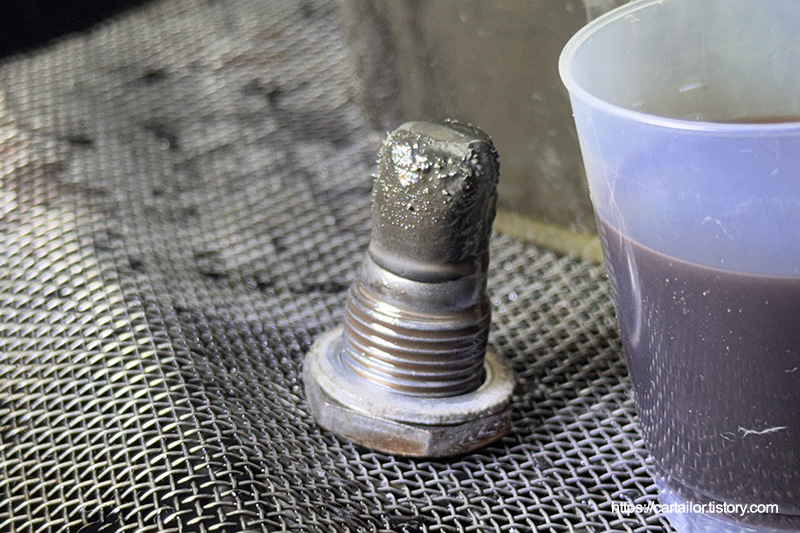 미션 드레인플러그에 슬러지가 많은 편이나, 별다른 이물질은 없어 특이사항은 없어 보입니다.