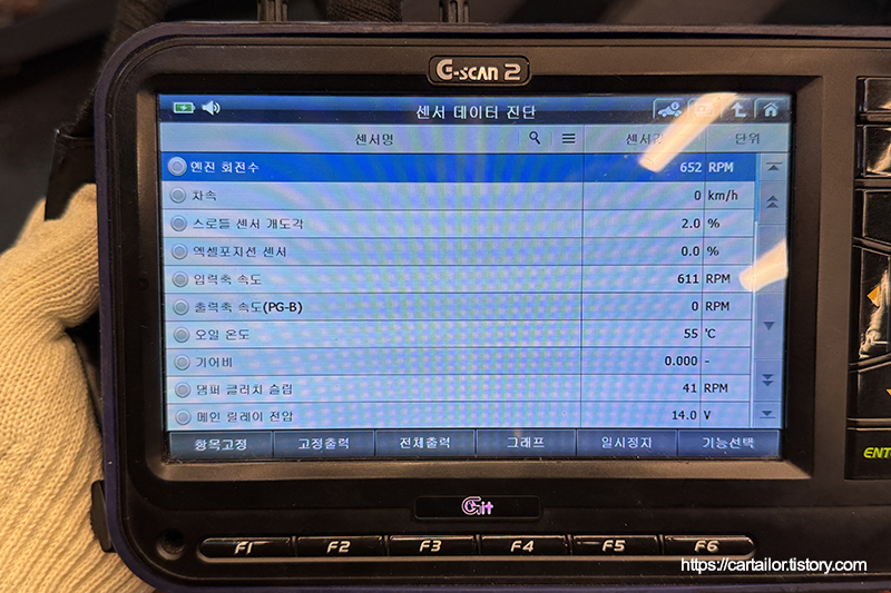 입고 직후 확인한 미션오일 온도로, 오일을 배출하기엔 온도가 다소 높아 다른 작업 먼저 시작합니다.