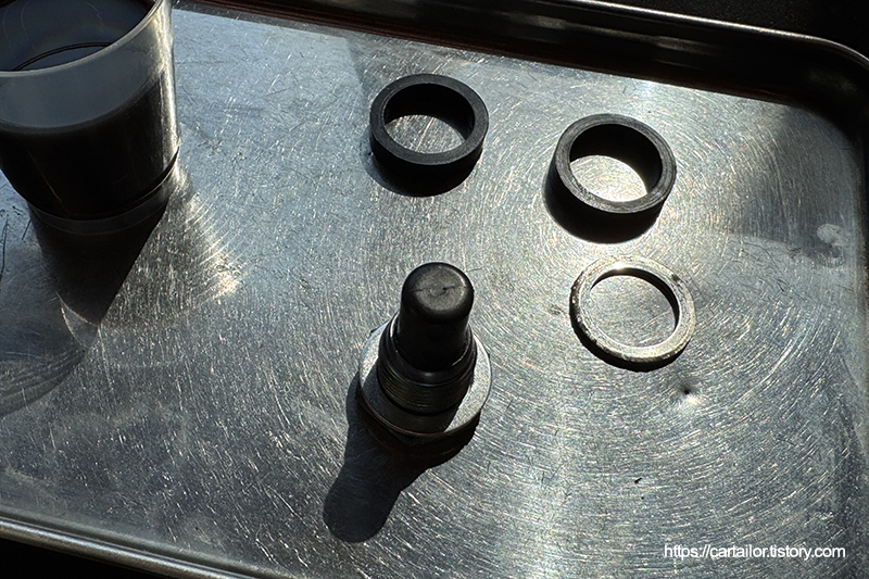 세척이 끝난 플러그에 신품 와셔를 걸어줍니다. 레벨링플러그 오링도 신품으로 준비합니다.