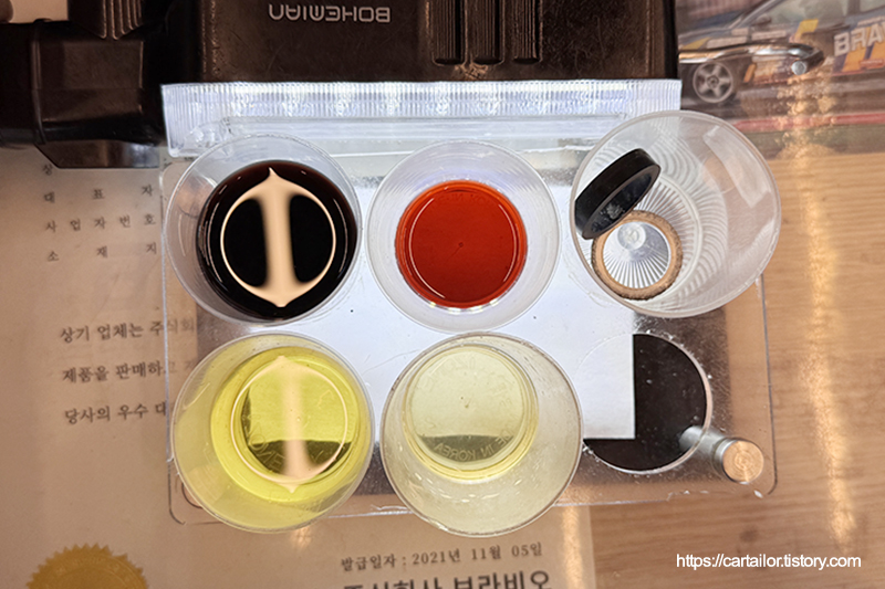 좌측은 기존 사용유, 우측은 레벨링 시 배출된 미션오일입니다. 우측이 현재 차량의 변속기 오일 상태로 보시면 되겠습니다. 하단 좌측은 기존 브레이크액, 우측은 신유입니다.