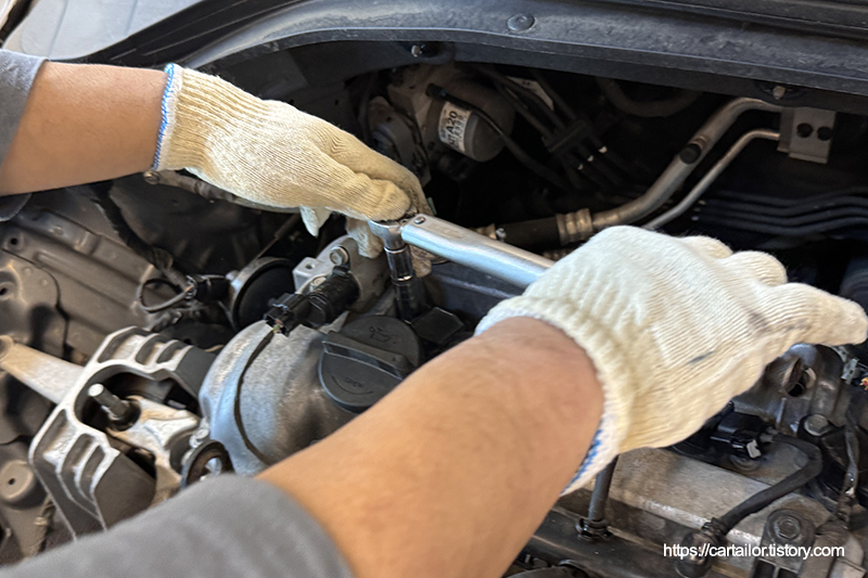 점화코일에도 전용 씰란트를 소량 도포 후, 규정 토크로 체결해 마무리합니다. 시동을 걸어 특이사항 유무 확인 후, 다음 작업으로 넘어갑니다.