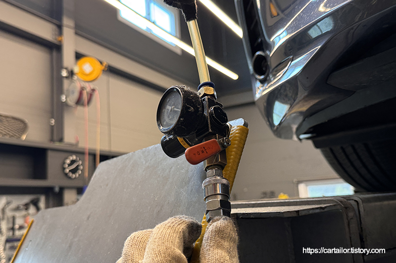 이번엔 미션오일 잔유 배출을 위해 차를 반대로 기울인 뒤, 입으로 부는 정도의 약한 세기로 에어를 불어 넣어 내부에 남아있는 잔유를 최대한 많이 배출합니다.
