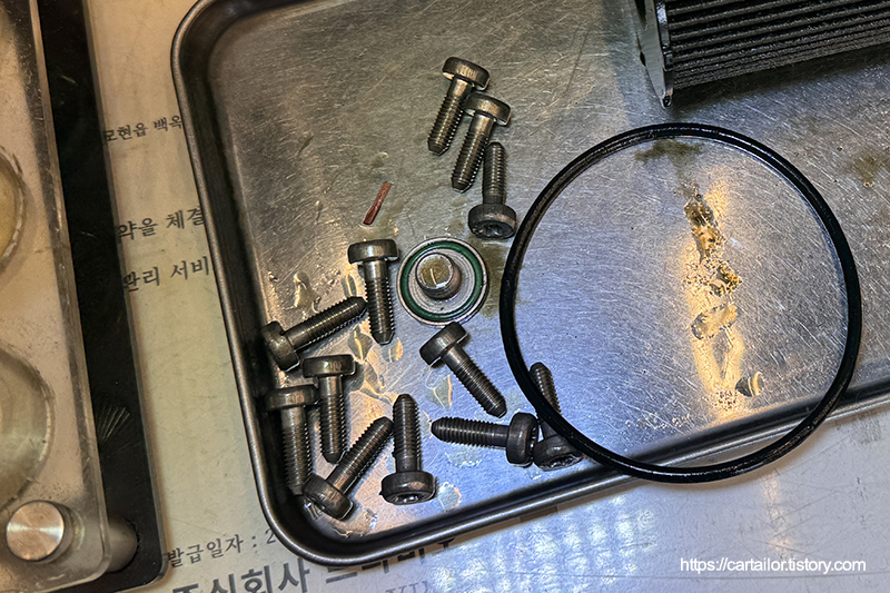 기존 사용유를 배출한 뒤, 오일팬을 탈거해 필터와 가스켓을 제거합니다.
