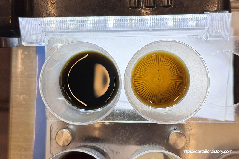 미션오일로, 좌측부터 기존 사용유, 레벨링 시 배출된 오일입니다. 우측이 현재 차량의 변속기 오일 상태로 보시면 되겠습니다.
