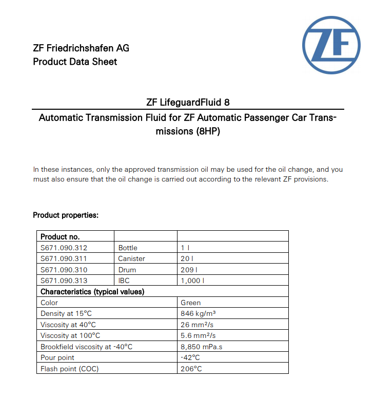 상온 밀도는 특이한 사항이 없는데, 섭씨 40도에서의 냉각 점도가 26mm2/S 로 상당히 묽습니다. 보통 현대 기아 파워텍에 많이 쓰는 규격인 SP4의 냉각점도가 30mm2/S 초 중반을 오르내리거든요. 냉간 유동성이 매우높고 냉간 상태에서 유온상승이 빠를 것 같습니다. 아마 ZF8 규격이 아닌 제품을 넣게 되면 냉각 변속지연이나 충격이 두드러질 것 같이 보입니다. 열간 안정성을 보여주는 지표 중 하나인 인화점 역시 206도로 우수합니다.