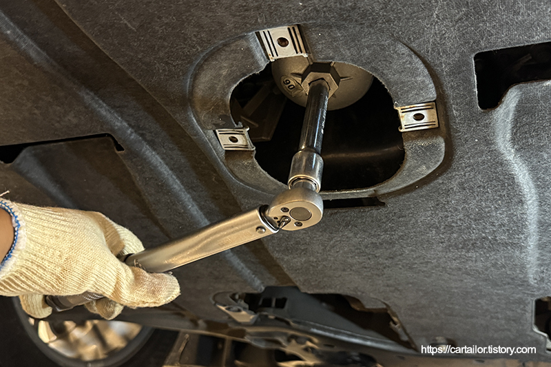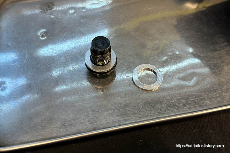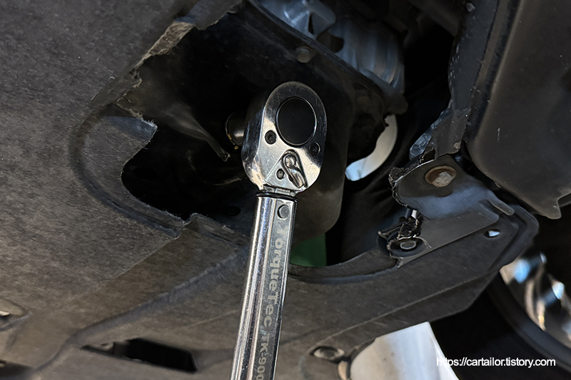 드레인플러그 와셔를 신품으로 교체합니다. 오일 배출이 완전히 끝났으면 플러그를 손으로 돌려준 뒤, 토크렌치를 이용해 규정 토크로 체결합니다.