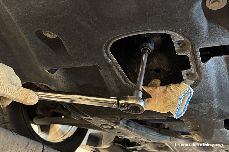 플러그와 와셔가 한 몸이 되어버린 상태로, 모두 신품으로 교체합니다. 배출이 완전히 끝났으면 와셔를 교체한 드레인플러그를 손으로 돌려준 후, 규정 토크로 체결합니다.