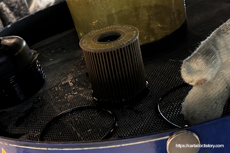 서비스 커버를 탈거 후, 프리드레인플러그와 오일필터 그리고 오링을 제거합니다. 그 후, 기존 사용유를 배출합니다.