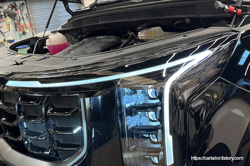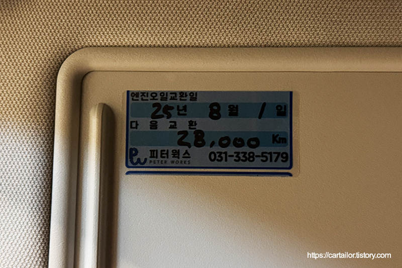 인포테인먼트 설정에서 서비스 시기 리셋 및 다음 엔진오일교환 주기를 기재한 스티커를 선바이저에 부착하면 엔진오일교환 작업이 종료됩니다.
