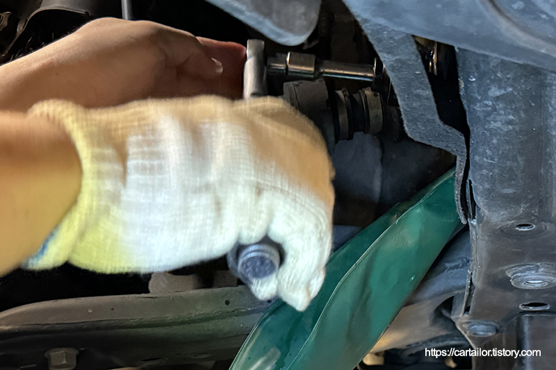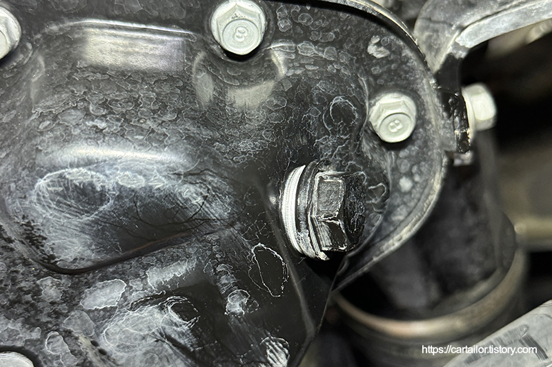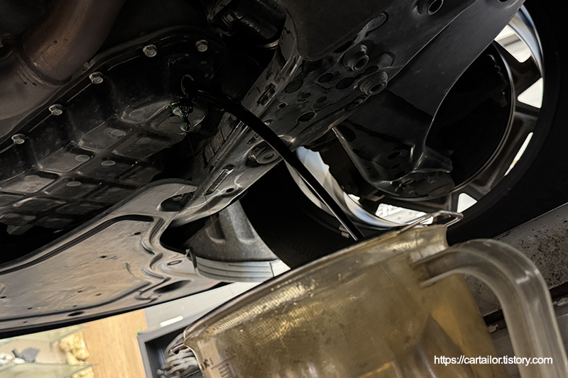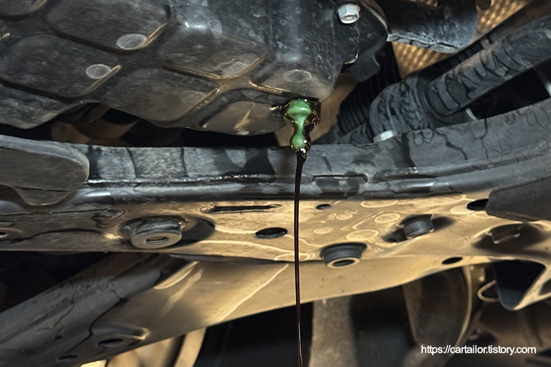 매 오일교환마다 함께 교체해야하는 드레인플러그 와셔를 신품으로 교환합니다. 오일 배출이 완전히 끝났으면 플러그를 손으로 돌려준 다음, 규정 토크로 조여 마무리합니다.