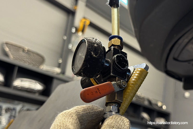 배출구 형상에 맞게 차량을 기울인 뒤, 입으로 부는 정도의 약한 세기롤 에어를 불어넣어 자연 낙하 방식만으로는 나오지않는 잔유를 최대한 많이 배출합니다.