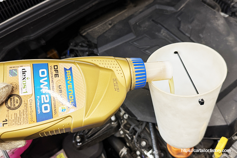 주입할 엔진오일은 라베놀 사의 플래그쉽 USVO라인의 DFE 0W-20제품으로, 높은 효율과 경쾌한 엔진구동 그리고 우수한 저온유동성과 같은 저점도 엔진오일 특유의 장점에 충실하면서도, 텅스탠 기반의 첨가제와 PAO 및 에스테르가 사용되는 베이스유로 높은 수준의 엔진보호와 우수한 정숙성까지 양립하기 어려운 부분들을 골고루 함께 누릴 수 있는 최고급 합성유입니다. 최근 쉐보레 엔진오일 규격 중 가장 최신인 DEXOS1 GEN3 공식 인증 업데이트가 완료되었으며, API 기준 SP 최신 규격입니다.