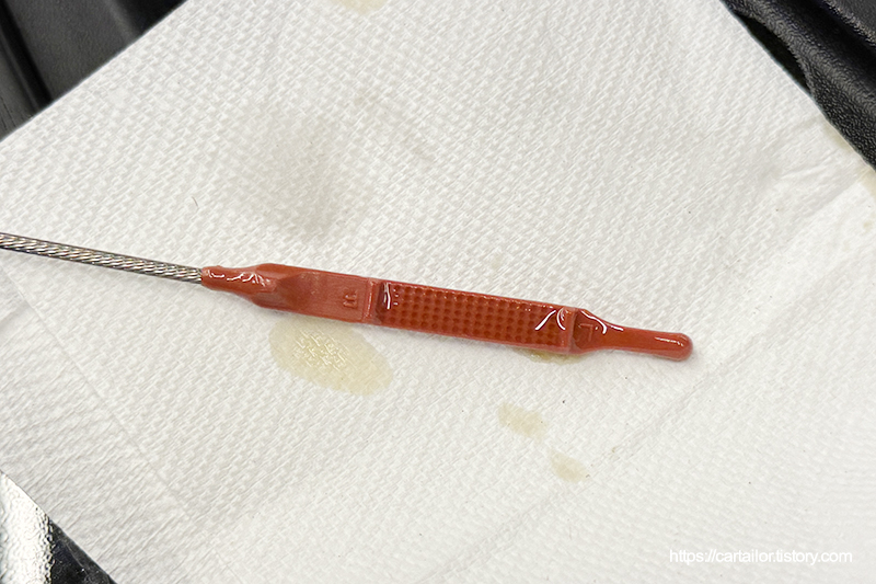 열간 상태에서 시동을 끄고 수분 후, 딥스틱을 뽑아 오일 상태를 체크합니다. 상태 및 오일량 모두 양호합니다.