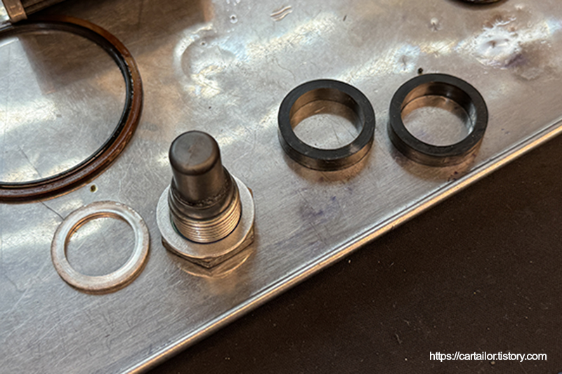 세정제를 이용해 깨끗하게 세척한 플러그에 신품 와셔를 걸어줍니다. 레벨링플러그 오링도 신품으로 준비합니다.