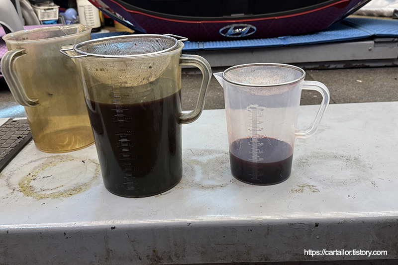 좌측부터 기존 사용유, 레벨링 시 배출된 오일입니다. 레벨링 시 배출된 오일이 현재 차량의 미션오일 상태로 보시면 되겠습니다.