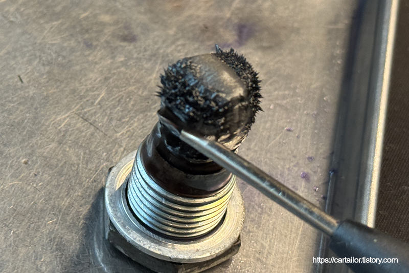 탈거된 드레인플러그의 모습입니다. 자성을 띄고 있어 메탈성 슬러지를 포집하는 역할을 하는데요, 큰 쇳조각과 같은 이물질을 확인되지 않아 별다른 특이사항은 없어 보입니다.