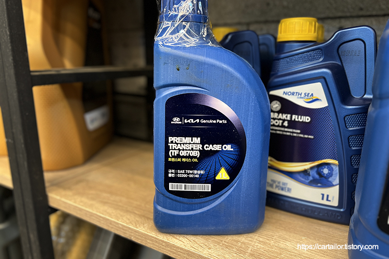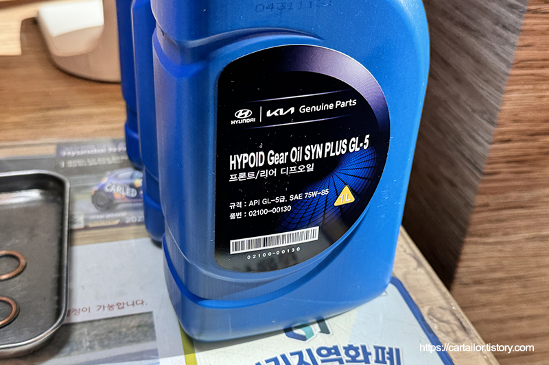 현대 순정 디퍼런셜 오일입니다. 해당 차량의 초도충진유와 동일한 GL-5 75W-85 하이포이드 기어오일로 준비했습니다.