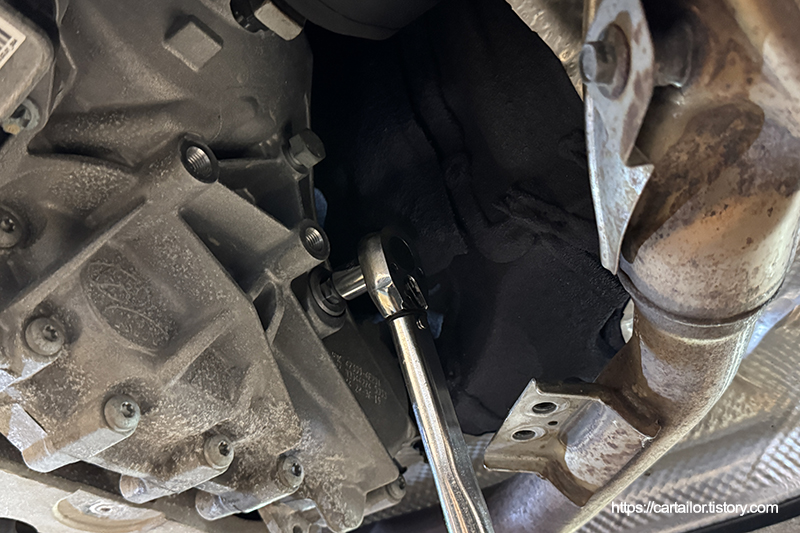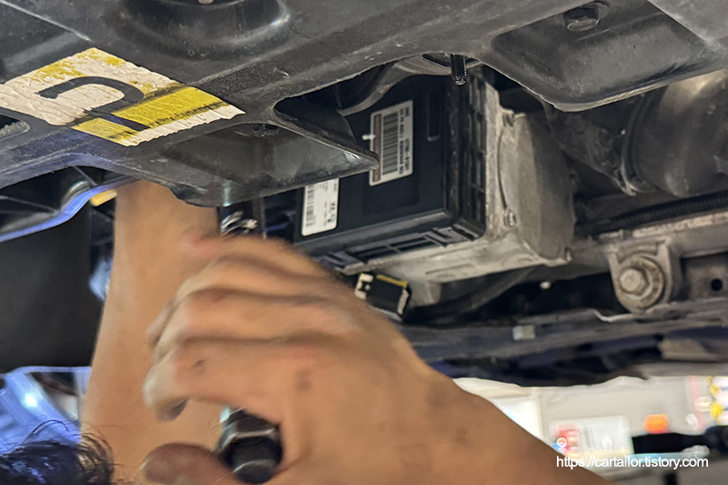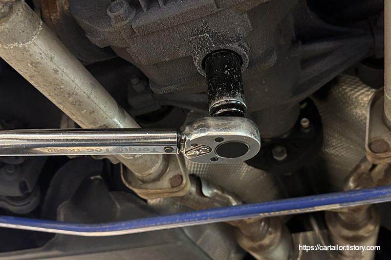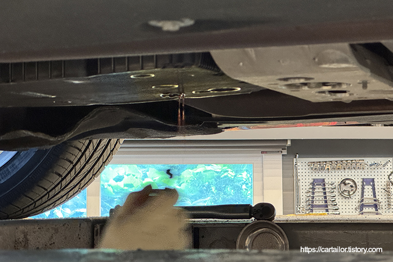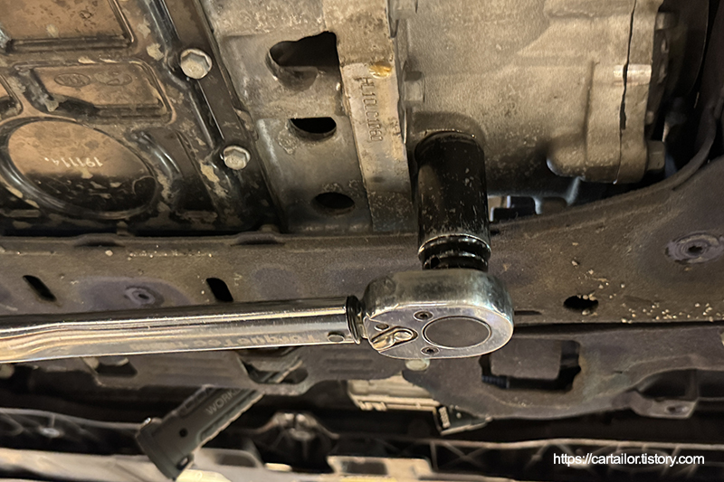 오일 배출이 완전히 끝났으면 드레인플러그를 손으로 돌려준 뒤, 토크렌치를 이용해 규정 토크로 체결합니다.