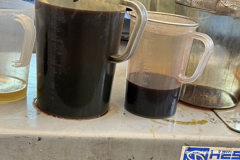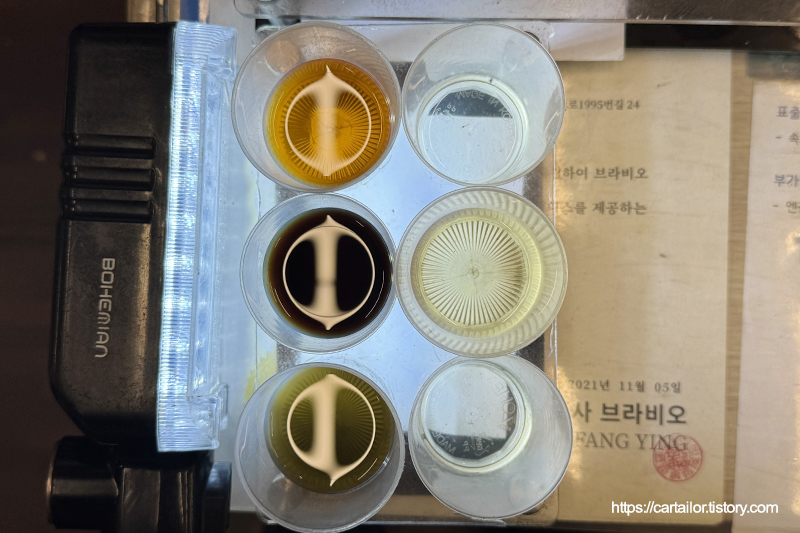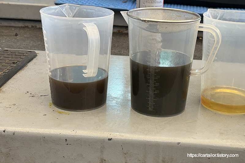 좌측부터 기존 미션오일, 레벨링 시 배출된 오일입니다. 우측이 현재 차량의 변속기 오일 상태로 보시면 되겠습니다.
