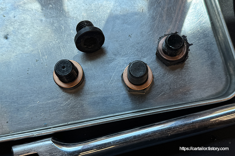전용 씰란트가 발린 신품 드레인플러그 그리고 신품 와셔를 사용하며, 세척 및 건조를 마친 주입구플러그에 신품 와셔를 걸어줍니다. 상태가 좋지 않은 전륜 주입구플러그도 신품으로 교환합니다.