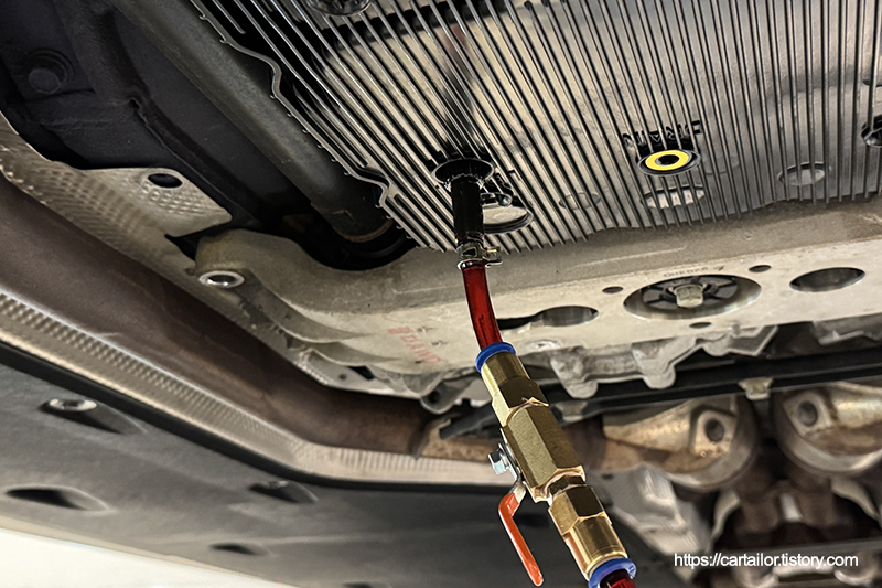전용 어답터를 장착 후, 레벨링 작업을 감안한 용량의 신유를 주입합니다. 시동을 걸어 변속을 진행 후, N단에 위치해 레벨링 작업을 시작합니다.