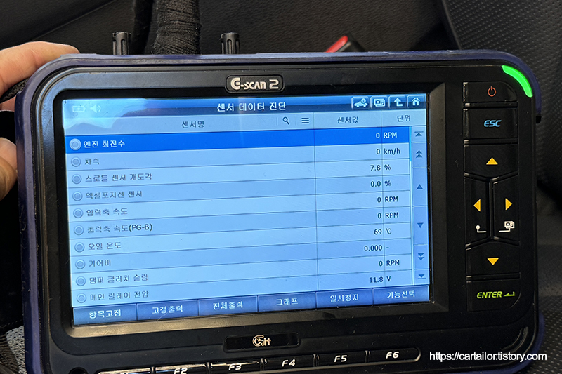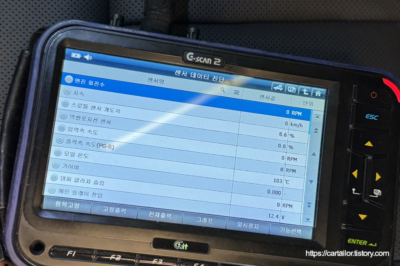입고 직후 확인한 미션오일 온도로, 오일 교체 작업을 하기엔 온도가 높아 다른 작업을 할 동안 식혀줍니다.
