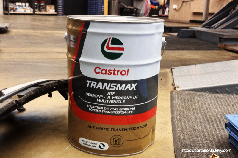 해당 차량의 미션오일 규격은 "ATF SP-IV-RR" 입니다. 현대 파워텍 후륜구동형 8단 전용 규격으로, 해당 규격을 정확히 충족하는 캐스트롤 트랜스맥스 DEXRON-6 제품으로 준비합니다. DEXRON-6가 GM이나 쉐보레 차량 전용으로 아시는 분들도 많은데, DEXRON-6 공식인증 제품의 경우 ZF변속기(저점도), CVT(고점도)나 DCT 등의 특수한 자동변속기를 제외하면, 일반적인 토크컨버터 형식의 자동변속기의 모든 규격을 충족한다고 보면 되는 가장 엄격한 최상위 규격으로 보시면 되겠습니다. 그만큼 동일 메이커의 DEXRON 인증이 제외된 일반적인 멀티 규격의 변속기 액보다 가격도 원가 기준, 2배 가까이 높습니다.