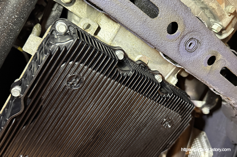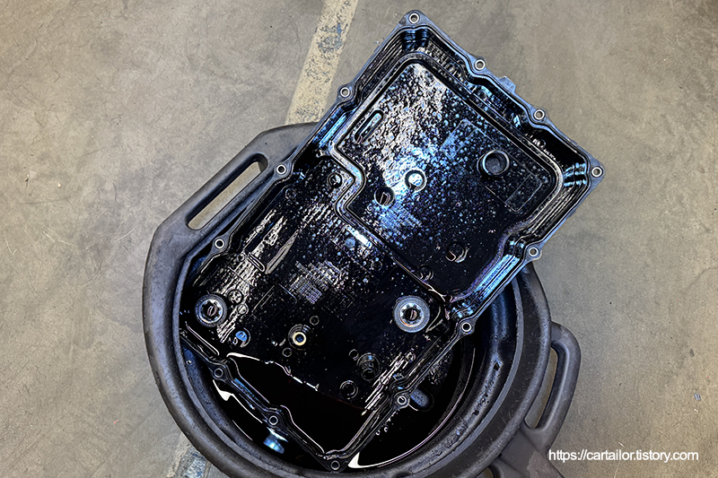 기존 미션오일을 배출 후, 오일팬을 제거합니다.