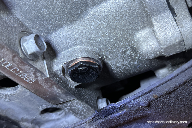 미션오일이 미량 혹은 방울 단위로 떨어질 때 재빨리 신품 레벨링플러그를 손으로 돌려줍니다.