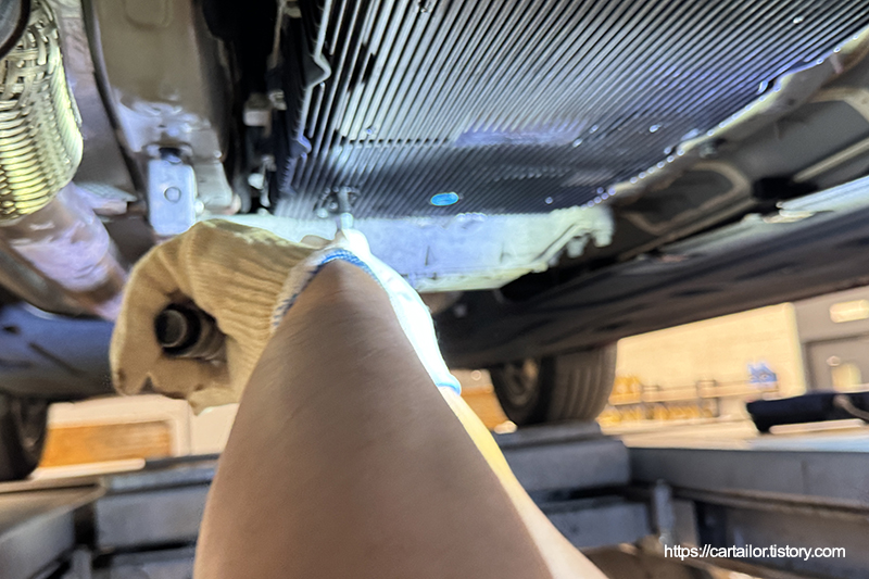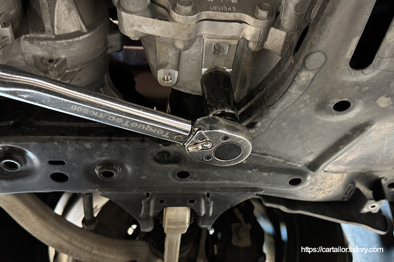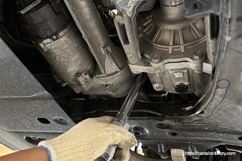 디퍼런셜 오일 배출이 완전히 끝났으면 드레인플러그를 손으로 돌려준 뒤, 토크렌치를 이용해 규정 토크로 체결합니다.