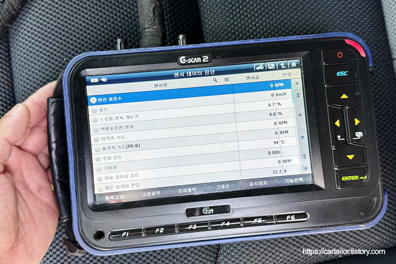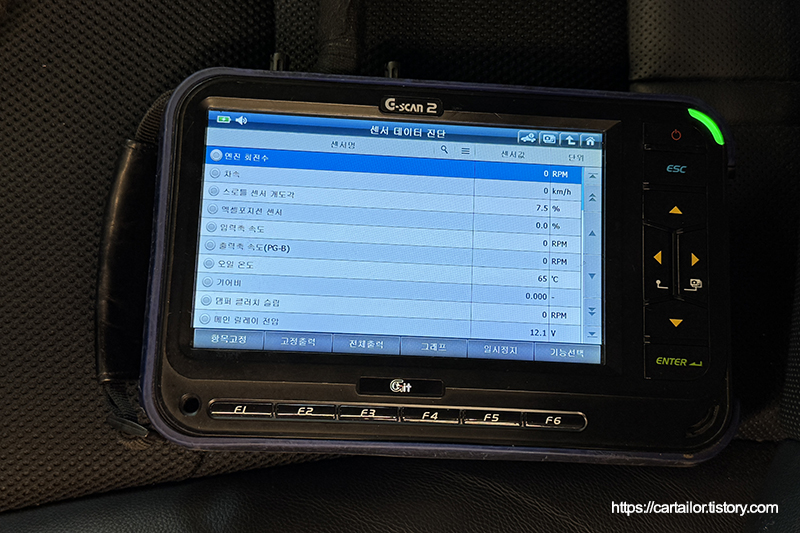입고 직후 확인한 미션오일 온도로, 온도가 높아 팬을 이용해 온도를 떨어뜨릴 동안 다른 작업 먼저 진행합니다.
