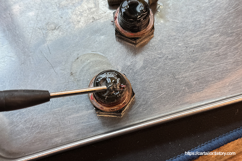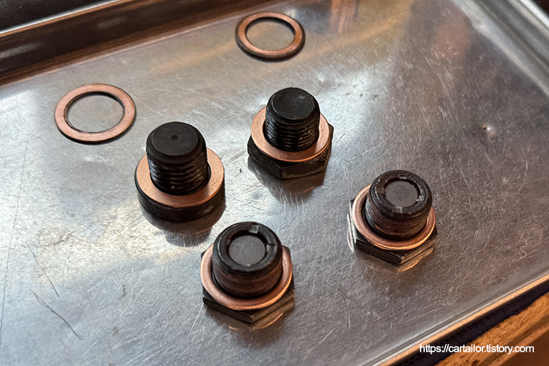 전용 씰란트가 발린 신품 드레인플러그와 신품 와셔를 사용합니다. 주입구플러그는 세척 후, 신품 와셔를 걸어줍니다.