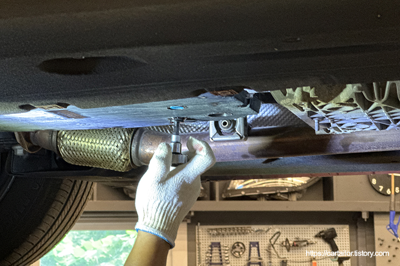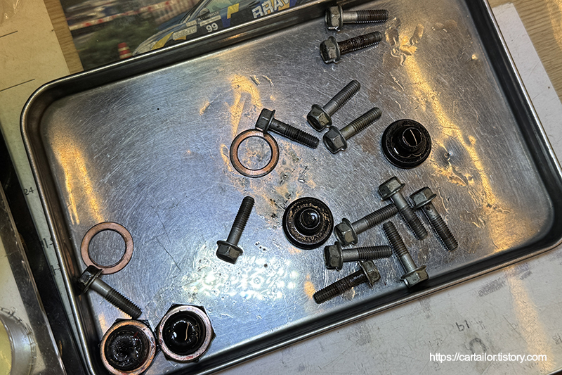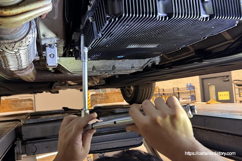 오일팬을 장착한 뒤, 신품 고정 볼트를 손으로 돌려 가고정합니다. 오일팬 위치 조정이 끝났으면 모든 규정 볼트들을 토크렌치를 이용해 규정 토크로 체결합니다.