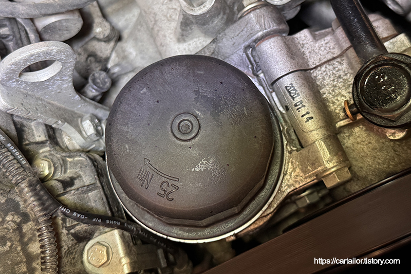 세척 및 건조를 마친 필터캡에 신품 필터와 오링을 장착한 후, 모든 접촉면에 신유를 발라줍니다. 토크렌치를 이용해 규정토크로 체결합니다.