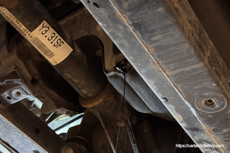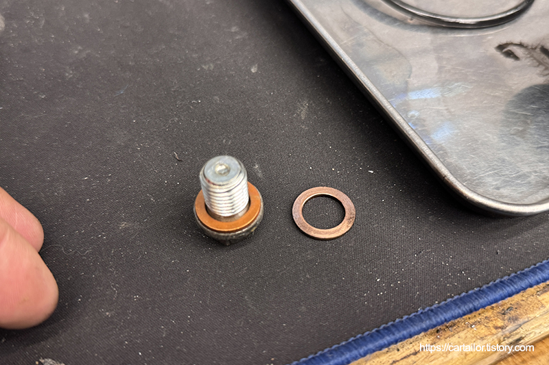 드레인플러그 와셔를 신품으로 교체 후, 오일 배출이 완전히 끝났으면 토크렌치를 이용해 드레인플러그를 규정 토크로 체결합니다.