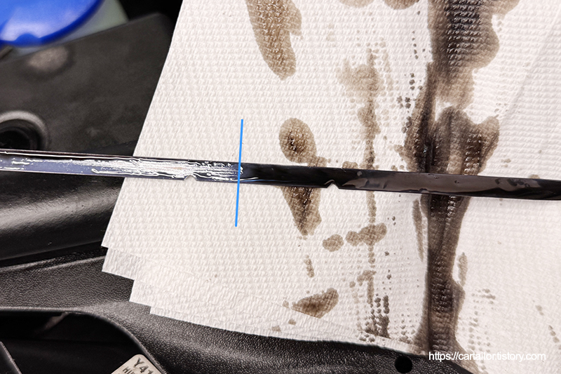 웜업 상태에서 시동을 끄고 수분 후, 엔진오일 레벨을 체크합니다. 양호합니다.