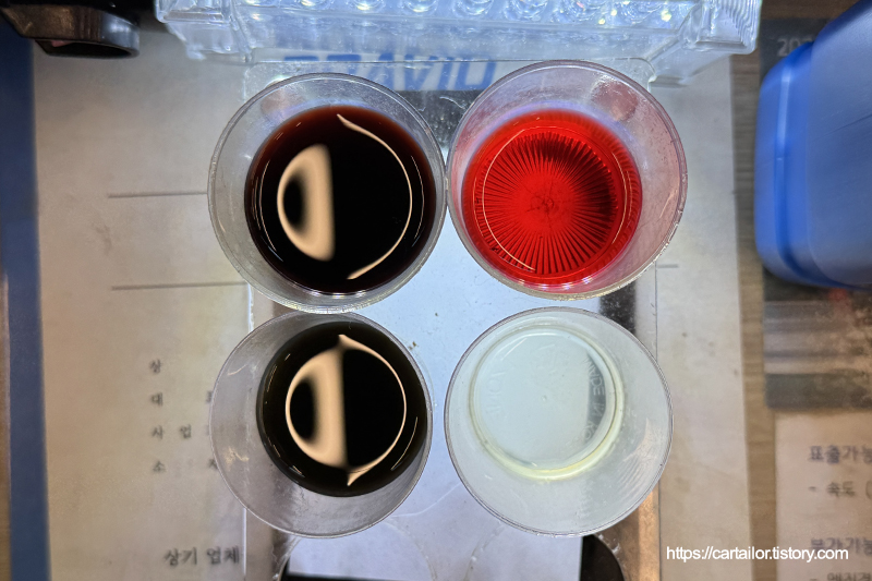 상단 좌측은 기존 미션오일, 우측은 레벨링 시 배출된 미션오일입니다. 우측이 현재 차량의 미션오일 상태로 보시면 되겠습니다. 그 밑의 좌측은 기존 디퍼런셜오일, 우측은 신유를 샘플링한 모습입니다.