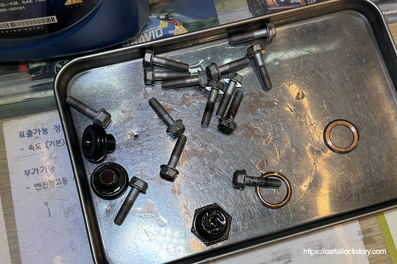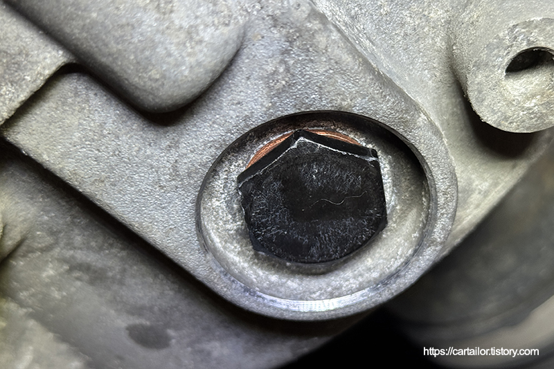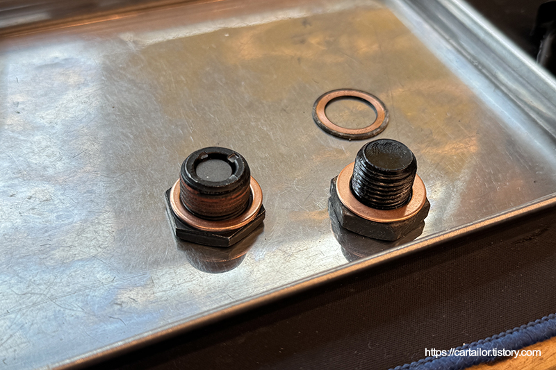 전용 씰란트가 발린 신품 드레인플러그 그리고 드레인과 주입구플러그에 들어가는 와셔는 모두 신품으로 사용합니다.